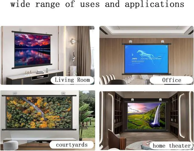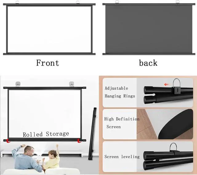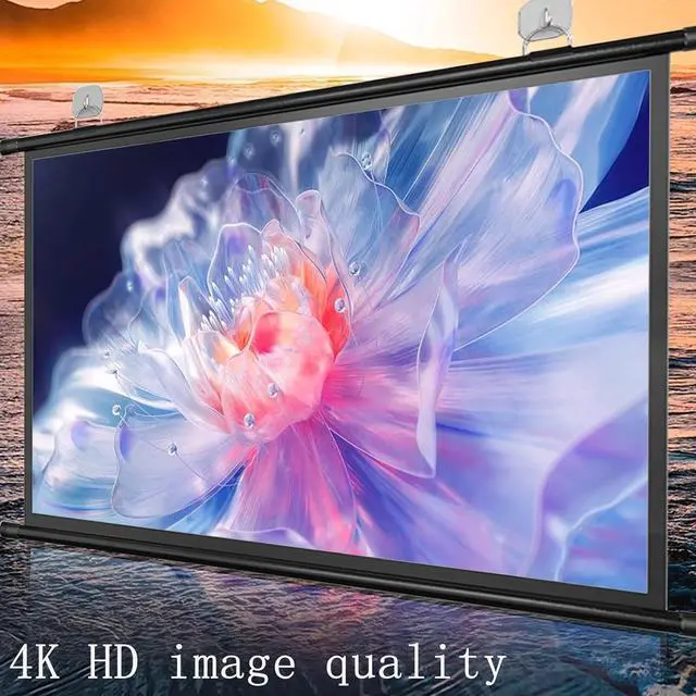 The projection screen is easy to install and can be installed on the wall with adhesive hooks, providing a better viewing experience and stabilizing the image. The hanging ring is flexible and the hook position can be freely adjusted, making installation flexible and convenient.