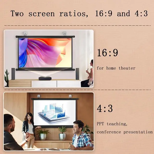 The wall-mounted projection screen is made of high-quality white fiberglass screen, available in 4:3 and 16:9 aspect ratios, which are dust-proof, flat, durable and not easy to wrinkle. The black frame design can not only set off the picture, but also enhance the overall picture contrast.