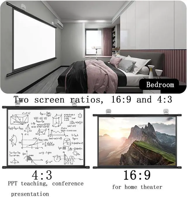 Anti-wrinkle movie screen 16:9 and 4:3 format, 160° wide viewing angle, even if you want to invite neighbors or friends to watch the movie together, it will not look crowded.