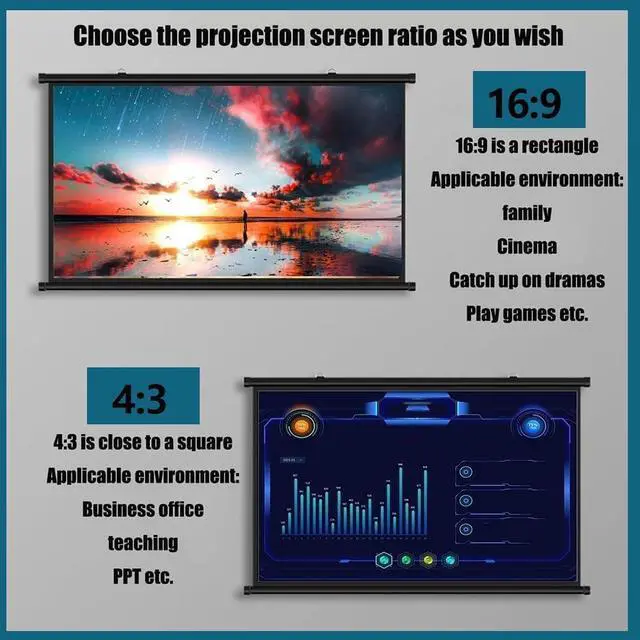 Screen format: With both 4:3 and 16:9 screen formats, our Movie Screen is compatible with various devices and ensures optimal display for different content. you're watching 4K or Full HD images