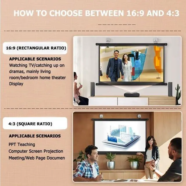 Format: the difference between the curtain ratio of 4:3 and 16:9, 16:9 curtain is more narrow, more suitable for home theater, watching movies and dramas; 4:3 curtain is more square, suitable for office, teachers, training, commercial projection, practical and practical.