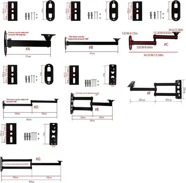 Multiple joint adjustable metal mount for projectors and security cameras, featuring 180° base rotation, 360 degree horizontal swiveling and 90° vertical tilting for flexible positioning.