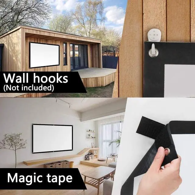 Easy to install: The projector screen can be easily installed with a variety of tools (hooks, ropes, and stickers), it only takes 5 minutes to set up, and the whole process is not complicated and can be done yourself