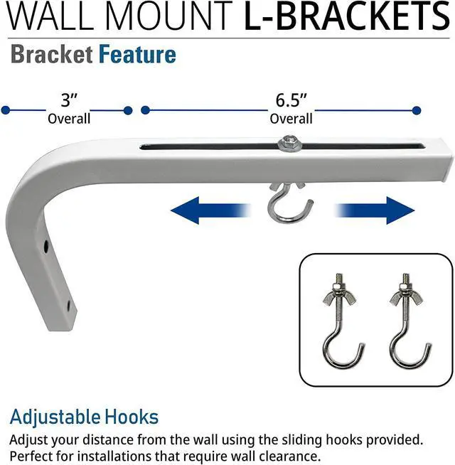 The L Bracket is 10-inches with adjustable distance designed allow for projector screen to be mounted from 3 to 10 away from the wall. Holds Up to 75 lbs. This wall mount installation kit Included: 2 L Brackets, 2 Sliding Hook w/ hardware, Hex screws, wall Anchors and washers. Universal designed can be used with most of any other brand Screen with adjustable hook.