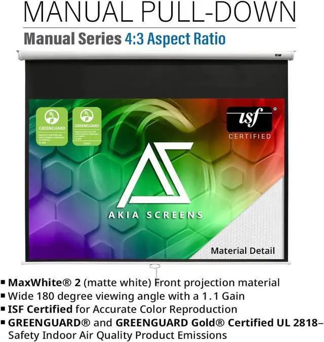 ISF Certified for accurate color reproduction. Enjoy close to reality colorful presentations on Akia Screens. GREENGUARD and GREENGUARD Gold Certified UL 2818 for Safe Indoor Air Quality Product Emissions. Good for use in schools and medical institutions, reducing the risk of harmful odors or sensitive ingredients while protecting children and elders.