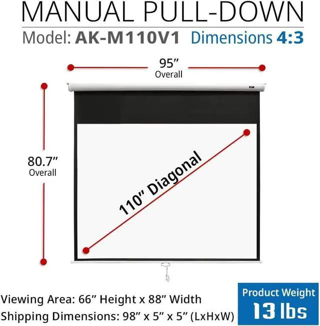 SIZEThis projector Screen is 110-inch Diagonal, 4:3 Aspect Ratio. View Size: 88 H x 66 W. White Case. Mounting Kit Included Wood screws x2, Dry wall anchor x2. Easily installs to wall or ceiling.