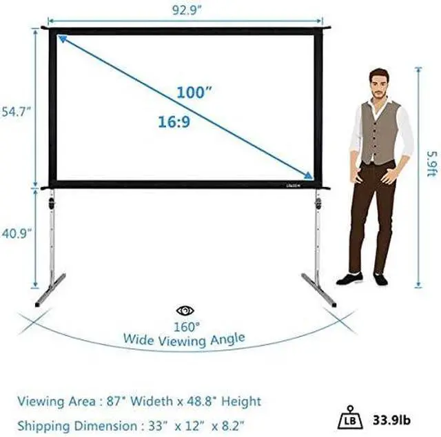 2. Aspect Ratio: 16:9 3. Dimensions: (92.9 x 95.6 x 40.9)" (L x H x W) 3. Package Dimensions:33 x 13 x8.2" (L x W x H) 3. Height Adjustment: 60.2"-107.9" 4. View Size: (87 x 49)" (L x H) 5. View Angle: 160° wide viewing angle 6. Gain: 1.0-1.1 7. Screen Material: PVC 8. Portable Bag Dimensions:33.4'' (L) X 13.3'' (W) X 7.4'' (H) 9. Frame Material: Silver Aluminum 10. Net Weight: 33.7lb 11. BrandLeadzm