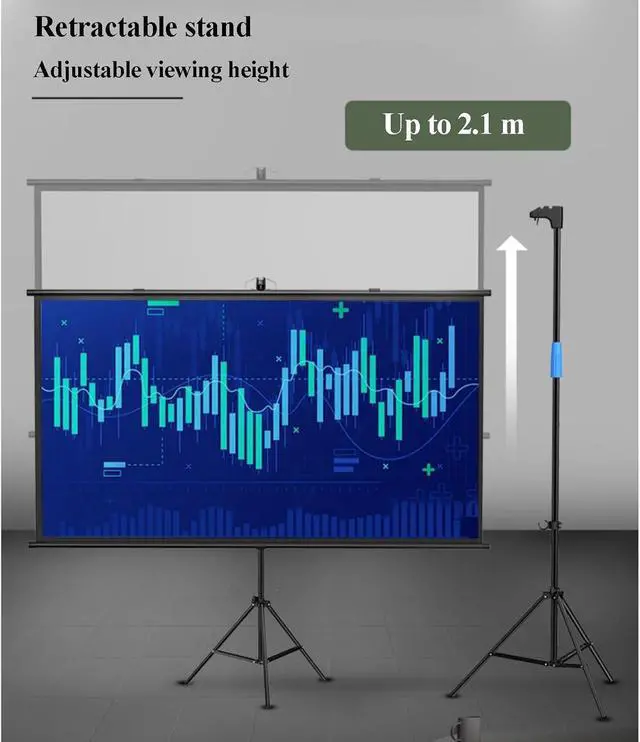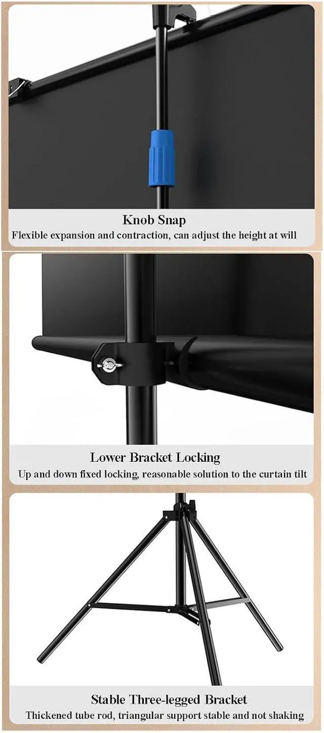 PROJECTOR SCREEN WITH STAND: The sturdy tripod stand can be stretched, folded and adjusted, along with the four aluminium tubes has spring tension on its end, which is to sustain a stable structure of whole screen, especially when you use it outdoor