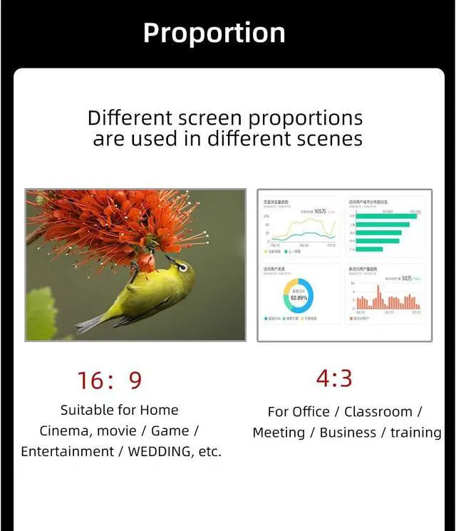 It is suitable for multiple occasions, a great choice for home theater movies, classroom training, conference room presentations, public display, etc.