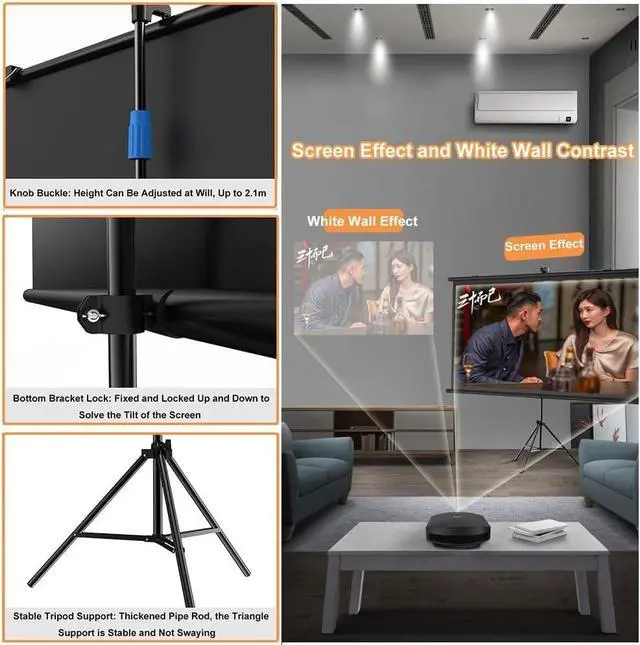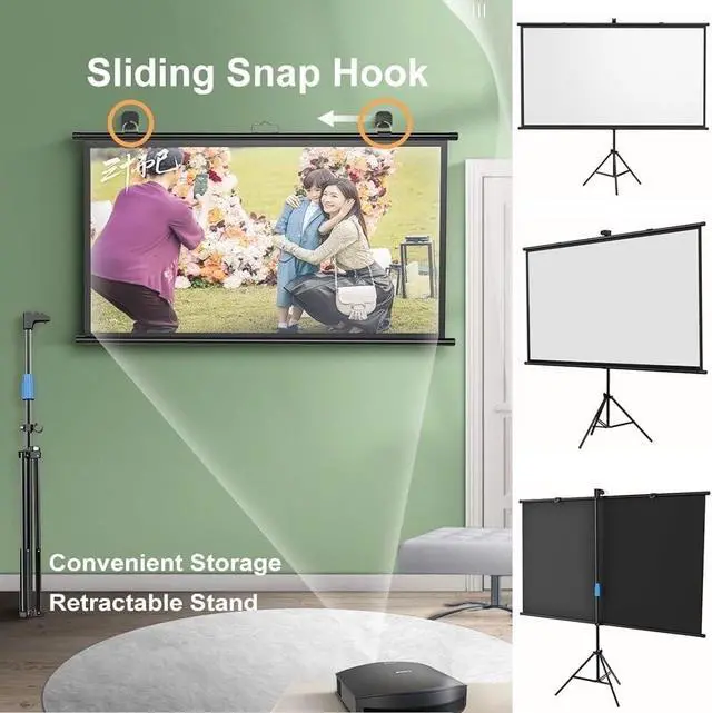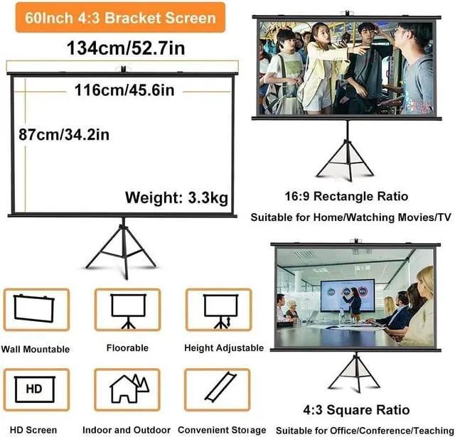 • PROJECTION SCREEN SIZE: The movie projection screen is 60 inches diagonal 4:3 16:9 format 168° wide viewing angle HD resolution, suitable for most projectors on the market.