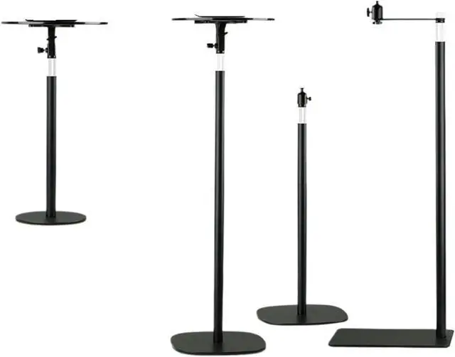 This floor stand features adjustable mounting mechanisms that accommodate most standard projectors, providing flexible placement options for various environments.
