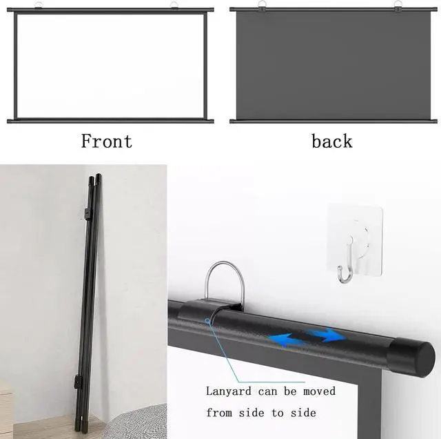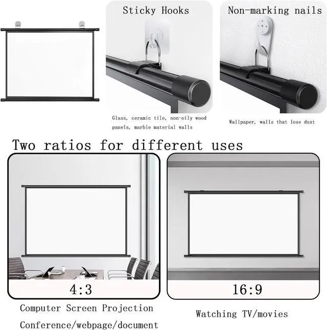 The projection screen is easy to install without tools. Just use the included adhesive hooks or traceless nails to complete the installation. It can be applied to walls of different materials.