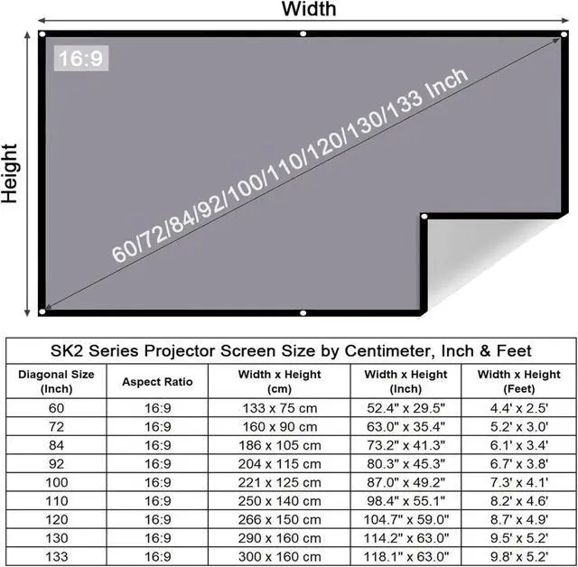 Please check your size before making the order we offer 607284/92/100/110/120/130/133 inches for choose, the size is diagonal size, you can check their width and height from the following form.