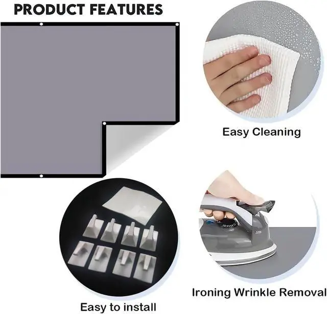 The projection screen has black edges and eyelets around it which making it easy to install. We offer 8 sets of free hooks that come with the product, you can use these hooks for quick installation, or you can prepare your own rope to pass through the eyelets to hang it.