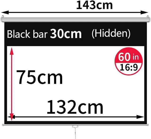 Size: 60in (4:3) 122x91cm, 60in (16:9) 132x75cm, 72in (4:3) 146x110cm, 72in (16:9) 159x90cm;