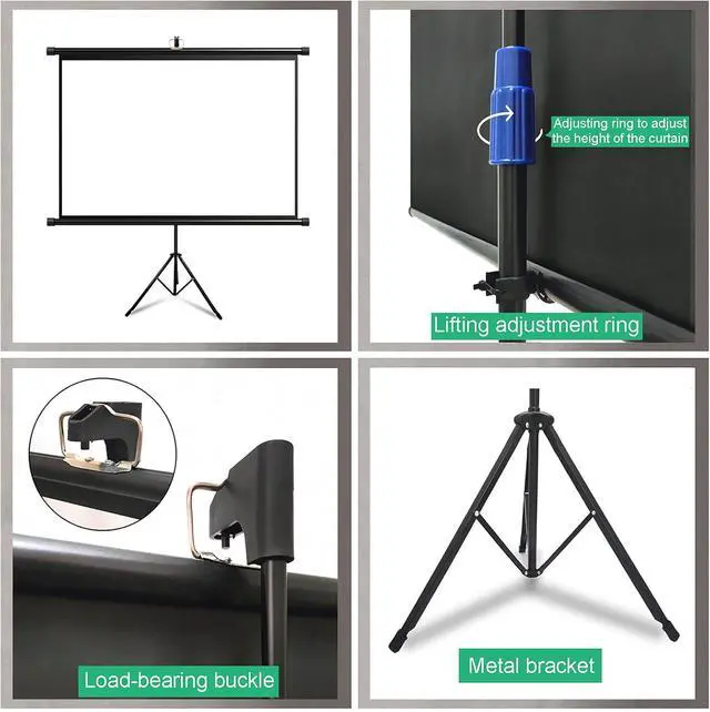 Height Adjustment: The projector screen is equipped with a tripod to ensure stability on various floors. Its legs are foldable for easy storage. The height of the stand can be adjusted by turning the knob for a comfortable experience.