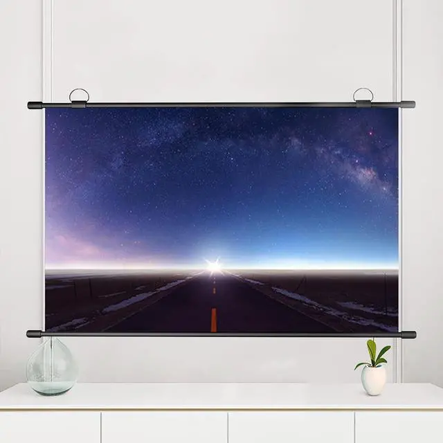 The portable projector screen can be rolled up and will not take up extra space after storage. The top hook design can be moved freely and can be easily hung in any situation.