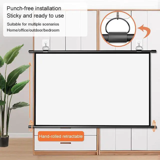 This projection screen can be easily hung on a wall hook and can be removed at any time. The projection screen is small and can be placed in a corner after folding. It is very portable and easy to use.