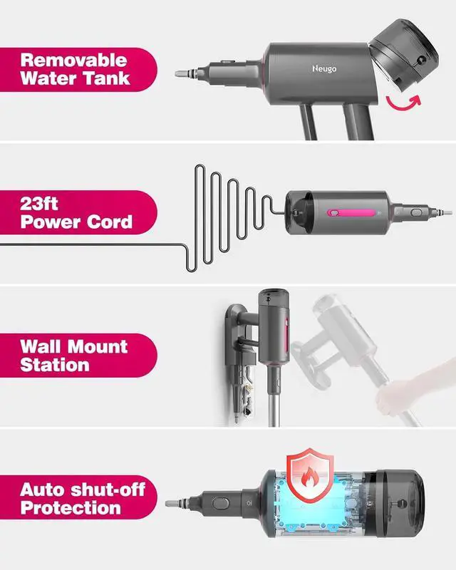 1500W 230 °F Steam, Deep Cleaning: Neugo powerful 1500 W steam mop produces continuous abundant steam and reaches temperatures of 230 °F to penetrate deep into surfaces, making it the perfect solution for deep cleaning and removing tough grime and grease with just water. Keep your floors sparkling clean. (ADD WATER ONLY, remove the carpet glider before mopping hard floor)