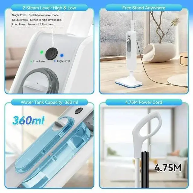 • Refillable 12oz Water Tank: 360ml large-capacity tank, refillable at any sink, and enjoy over 30 minutes of continuous steam for whole-house cleaning.