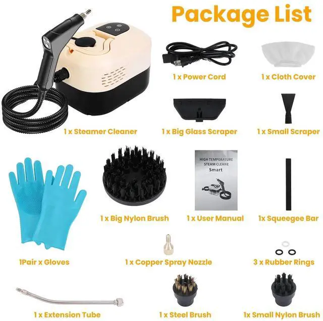 - Comprehensive Cleaning Kit:The multi-purpose steamer cleaner includes a variety of attachments,such as a high pressure copper spray nozzle,an extension tube,brushes,glass scrapers and squeegee bar,can be applied to every scene of your life,including metal surfaces such as stoves,cookware and sinks,as well as toy and furniture surfaces,and glass and tile surfaces. Meanwhile,it can be used on walls,countertops,range hoods,etc. When used with a cloth cover,it is also suitable for leather sofas and fabric surfaces. Moreover,it includes gloves for convenient use,providing a safe cleaning solution for you and your family.