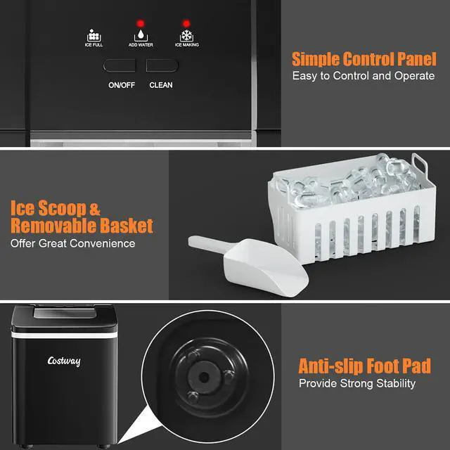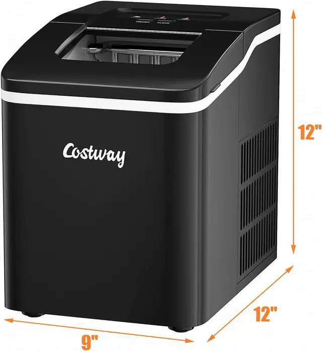 This countertop ice maker can produce 9 pcs bullet-shaped ice in 8 minutes and up to 26 lbs ice in 24 hrs, greatly satisfying your daily ice requirements. The capacity of the water tank is 1.6 liter. And the simple control panel with self-cleaning function provides great convenience. Designed with transparent lid, this portable ice maker allows you to view the progress easily. And it will not disturb you with 45 dB low noise. Featuring with portable yet compact design, this premium ice maker machine with ETL certification is perfect for home, office, party and bar.To enjoy the ice at its freshest, please use up ice in the basket or put it in the fridge to avoid melting around.