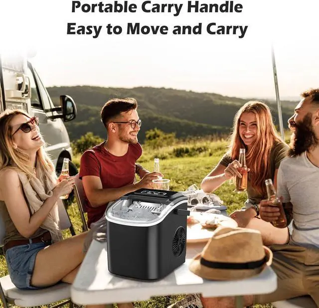 Portable & Compact Ice Maker This countertop ice maker machine is portable with a compact size of 11 x 9 x 11 inches. The tabletop ice maker machine is also designed with a convenient carry handle, making it easy to carry and suitable for various occasions like Home Bars, Camping, or RV trips.