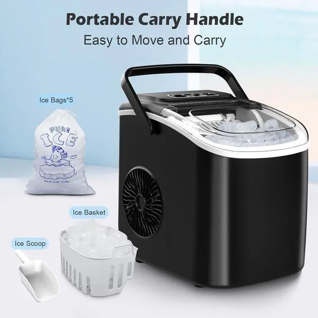 Superior Quality & Warranty Promise The package includes a handle, ice basket, ice scoop, ice bags, manual, and a well-designed package that can be given as a gift. Our mission is to provide customers with a premium counter ice maker at a reasonable price, enhancing your quality of life. We offer a 12-month warranty from the original purchase date and lifetime technical support. If you have any questions about using our ice machine, our 24/7 customer support is always ready to assist you.