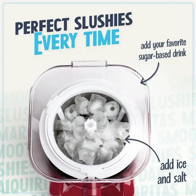 Bring friends and family together while adding thirst quenching fun to any occasion! Featuring a 32-ounce freezing chamber, it makes up to 32-ounces of your favorite slush drinks while the easy-flow spout dispenses consistently smooth frozen drinks. The tank detaches from the base for easy cleanup and includes a detachable cup rest and drip tray. Use your favorite sugar based drinks or create your own favorite slush!