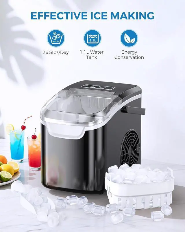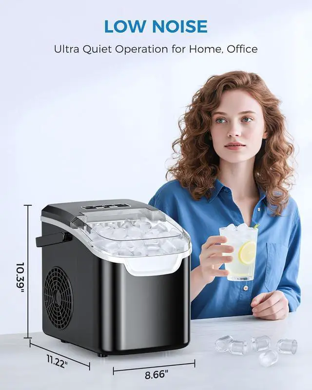 Portable and Space-Saving: This ice maker has a compact design and comes with a handle, making it easy to carry. The ice maker weight is 14.56 pounds.