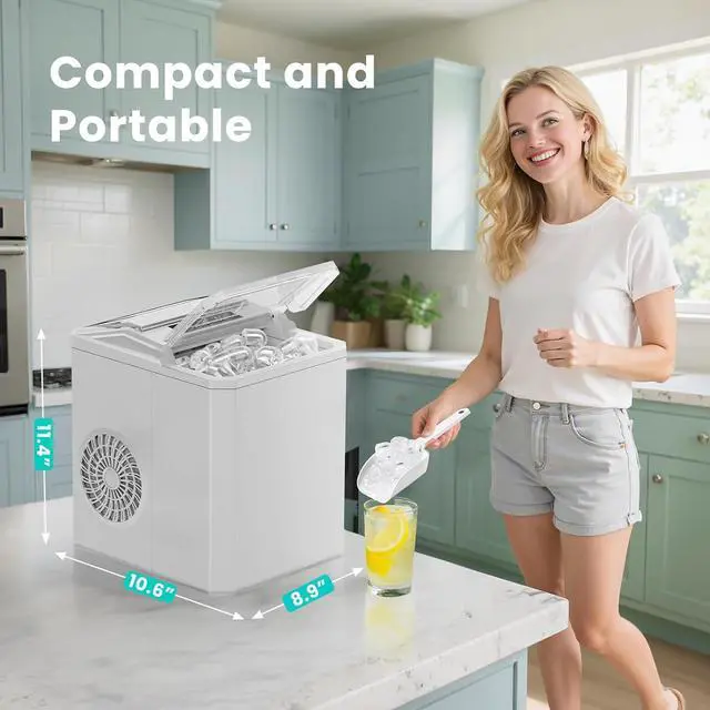 Compact and Portable:The ice maker countertop comes with a sturdy handle. It measures 8.9 * 10.6 * 11.4 inches and weighs only 15.4 pounds. Ice maker doesn't take up much space and is easy to carry, making it highly suitable for various occasions such as the kitchen, home, camping, RVs, parties, bars, dormitories, etc.