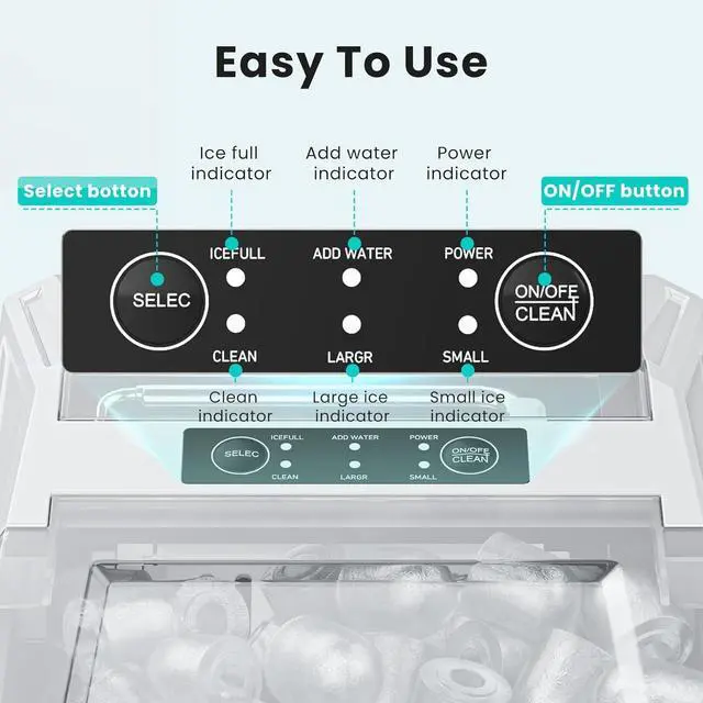 User-Friendly Operation: The clear ice cube maker control panel is designed for effortless usejust follow three simple steps to enjoy fresh ice cubes in no time. Intuitive indicators light up to signal when the water tank needs refilling or the ice bin is full. During operation, the portable ice maker operates at a noise level below 40 decibels.