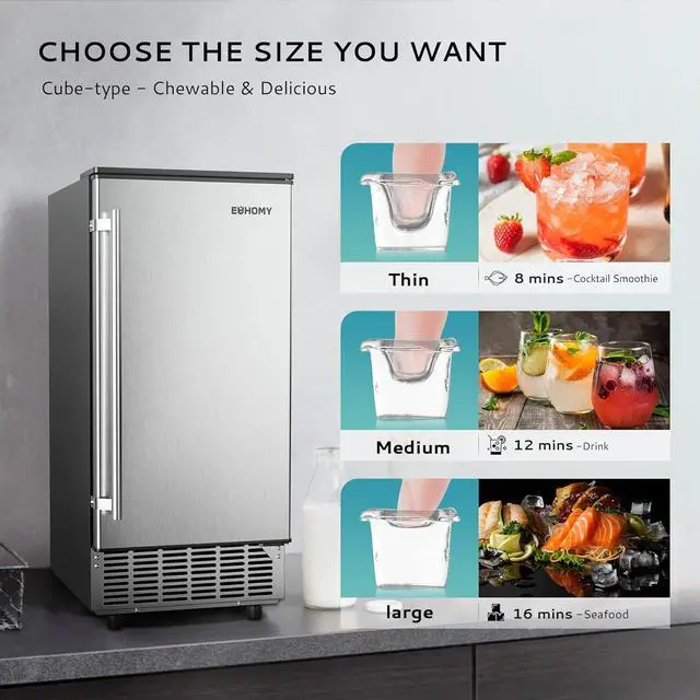 Reversible Door & Cold Insulation: The stainless steel ice maker machine door with a handle can be installed with left or right hinges, allowing you to choose the opening direction according to your needs. The 3-layer housing material ensures longer-lasting ice cubes, preventing them from melting quickly.