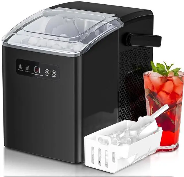 Compact Countertop Ice Maker It's more than a ice machine; it's a modern work of art. With dimensions of 11.81" x 9.06" x 13", Small ice maker's stylish design adds an elegant touch to any space. The transparent casing lets you check ice storage at a glance, and you can savor ice with the included scoop.