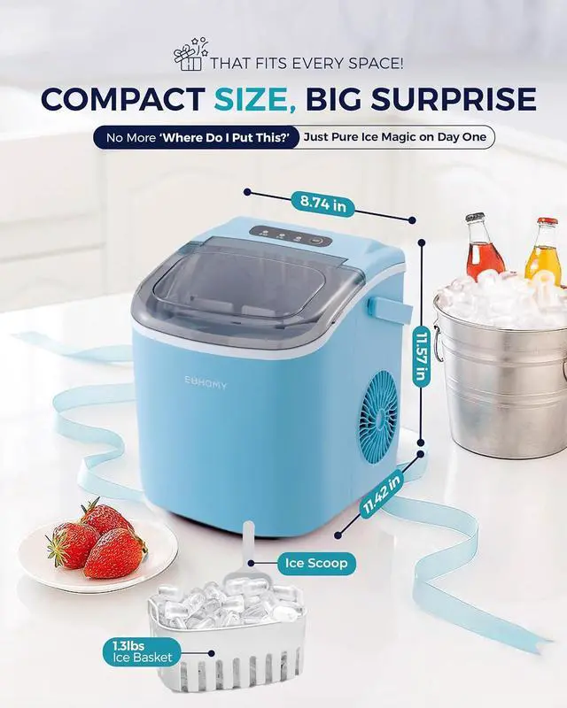 Superior Quality & Warranty Promise: Include handle, ice basket, ice scoop, manual and well-designed package can as gifts. Our Mission is committed to providing customers with premium Euhomy ice maker at a reasonable price. You totally deserve a more exquisite life! We offer 12-month warranty from the original purchase date; Lifetime technical service support. Suppose you have any questions about using our Ice Maker, Our 7*24-hour customer support is always ready to help you!