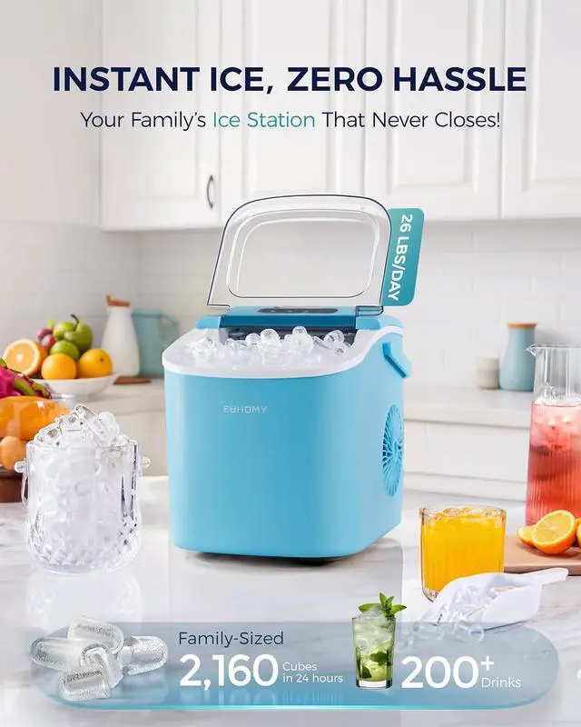 EUHOMY Countertop Ice Maker Machine with Handle, 26lbs in 24Hrs, 9 Ice Cubes Ready in 6 Mins, Auto-Cleaning Portable Ice Maker with Basket and Scoop, for Home/Kitchen/Camping/RV. Blue