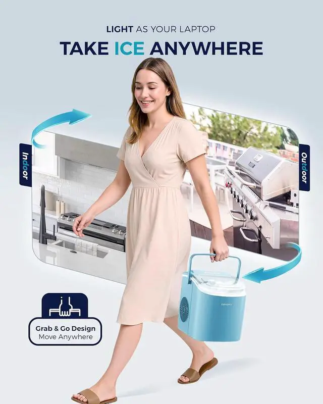 Portable Design & Perfect Bullet Ice: Our ice maker comes with a sturdy handle, weighs only 13lbs and with compact size 11.57(L)*11.42(W)*8.74(H)in. Those features make ice maker easy to carry and perform well on any occasions like Kitchen/Home/Camping/RV/Party/Dorm. Also, the newly designed countertop ice maker produce the most popular bullet-shaped smooth ice cubes, which won't stick together easily or hurt your hands or mouth even are perfect for cold drinks, iced coffee or chew as snacks.