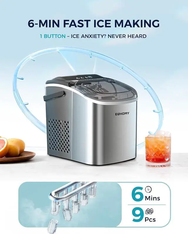 6 Mins Ice-Making & Ultra Quieter: Our Euhomy ice maker only takes 6mins that will enjoy the first batch of fresh bullet ice. With a 1.2L water tank and powerful compressor, the portable ice maker easily makes maximum ice capacity to 26lbs ice per day and holds up to 1.3lbs ice at a time. Also, our ice maker is not only excellent in refrigeration, but also at less than 45db normal noise, ensuring a comfortable and quiet environment to enjoy ice-making, similar to a working freezer.