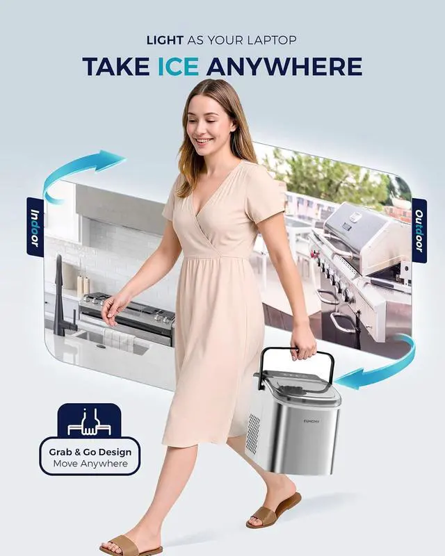 Portable Design & Perfect Bullet Ice: Our ice maker comes with a sturdy handle, weighs only 13lbs and with compact size 11.57(L)*11.42(W)*8.74(H)in. Those features make ice maker easy to carry and perform well on any occasions like Kitchen/Home/Camping/RV/Party/Dorm. Also, the newly designed countertop ice maker produce the most popular bullet-shaped smooth ice cubes, which won't stick together easily or hurt your hands or mouth even are perfect for cold drinks, iced coffee or chew as snacks.