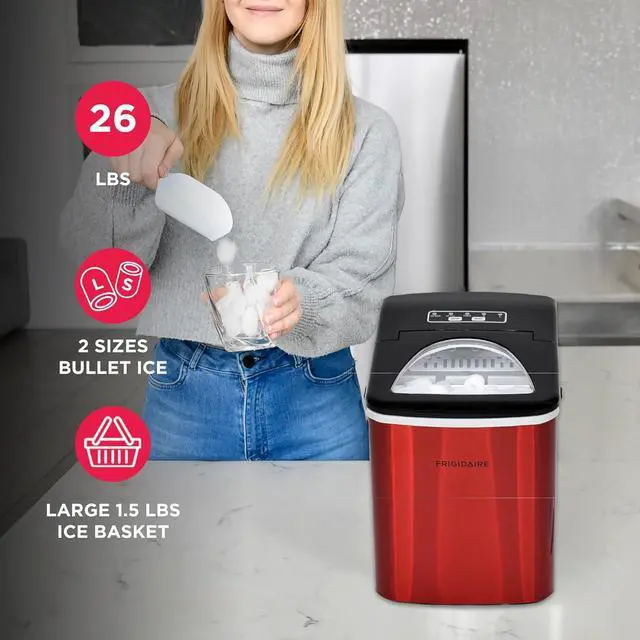 • Sleek Design - Never run out of ice again with the Frigidaire Ice Maker that produces up to 26 lbs. of ice per day. Elevate your space with its sleek stainless steel countertop design that blends seamlessly with any kitchen, bar, office, or dorm.