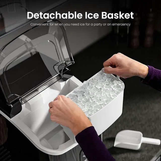 Portable DesignMeasuring only 9.06 x 12.99 x 11.81 inches and weighing only 18.7 pounds, our cube ice maker comes with a removable ice basket and ice scoop for easy access to your ice. Equipped with a sturdy carrying handle that allows you to place our portable ice maker anywhere, perfect for home & kitchen