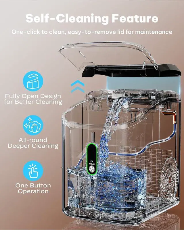 Effortless Self-Cleaning: The countertop ice maker features a convenient removable cover, allowing you to easily access every corner for thorough cleaning. Plus, it includes an automatic self-cleaning cycle that can be activated with a simple press and hold of the ICE/CLEAN button for 5 seconds, ensuring hassle-free maintenance and hygiene
