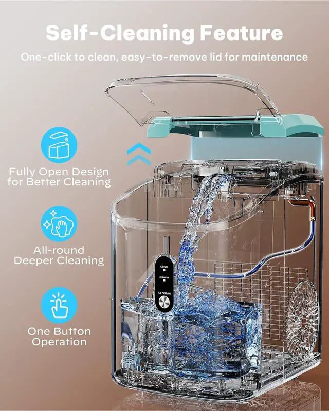 SELF-CLEANING FUNCTION - The countertop ice maker has a removable cover that makes it easy to reach every nook and cranny for deep cleaning. The ice maker also features an automatic self-cleaning cycle that can be activated by pressing and holding the ICE/CLEAN button for 5 seconds.