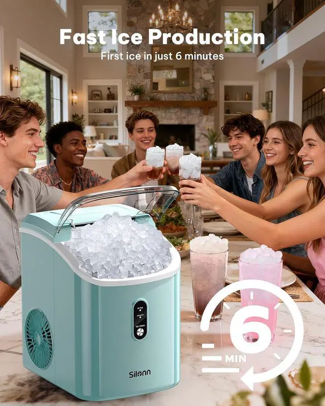 LIGHTNING FAST ICE MAKER - The Silonn Nugget Ice Maker can produce up to 33 pounds of ice per day. This countertop ice maker makes ice so fast that the first round takes only 6 minutes, much faster than the average 20 minutes.