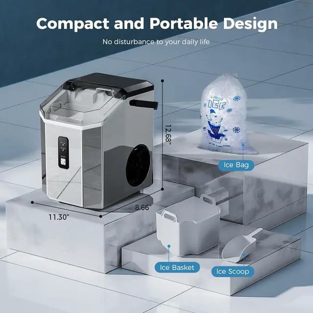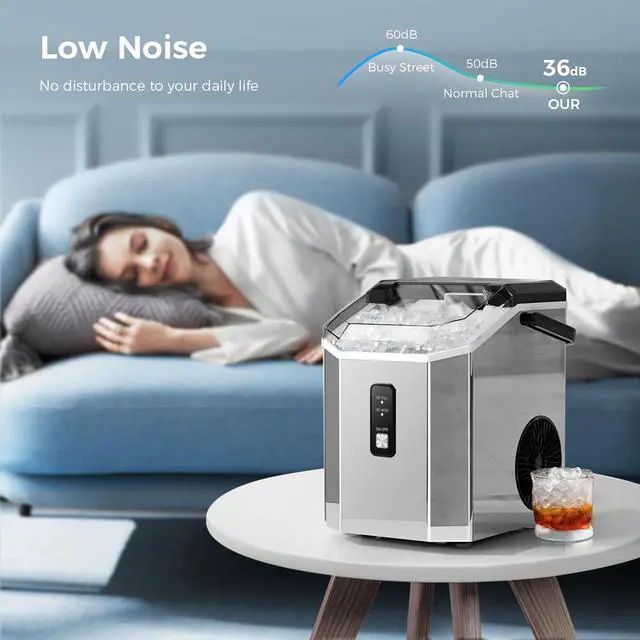 User-friendly DesignEverything for a better experience. Our pebble ice maker comes with an ice basket that makes carrying the ice cubes from place to place a breeze. Besides, the ice maker has an ice scoop holder on the back to make it easy to store the ice scoop when you're not using it. With a noise level of only 36dB, so you can enjoy fresh ice without any distractions
