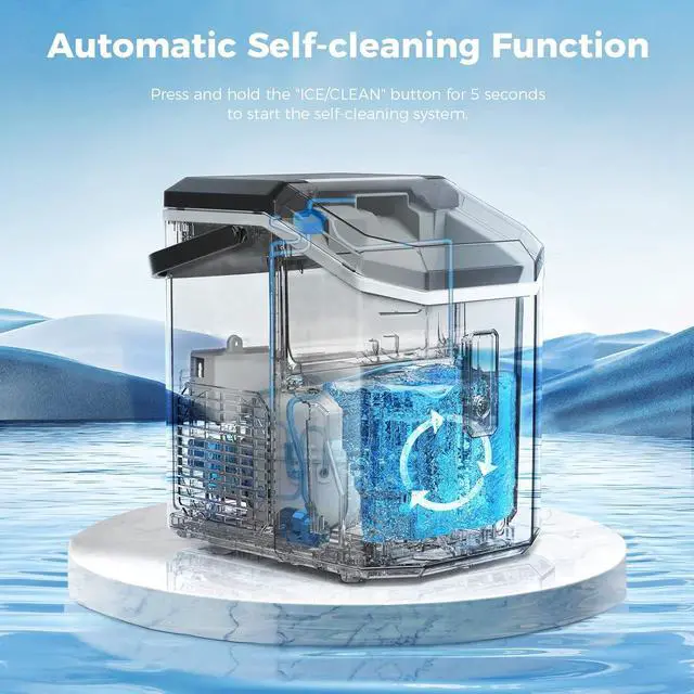 Self-cleaning and Easy to UseWith just one button, this countertop ice maker is easy to use and control. Fill the ice maker with water, press the 'ICE/CLEAN' button and that's it. The "ADD WATER" indicator turns on when the ice maker is lack water and the "ICE FULL" indicator turns on when the ice basket is full. Just press 'ICE/CLEAN' button for 5s to enter self-cleaning function, which makes maintenance a breeze
