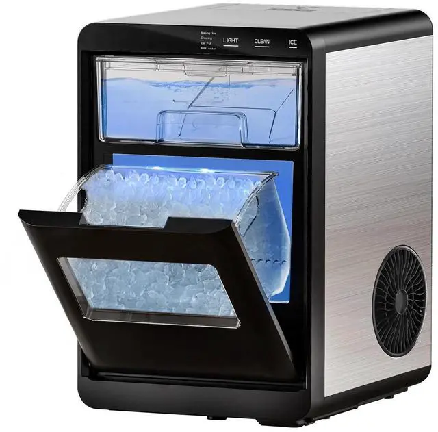 Experience the ultimate convenience with our countertop nugget ice maker. With a capacity of 44lbs/24H, this small ice maker machine produces a large quantity of ice in just one day, ensuring you never run out of your favorite chilled beverages or snacks. The rapid ice production feature allows you to enjoy freshly made ice in no time, perfect for any occasion. But that's not all - our pellet ice maker also creates chewable ice, providing a satisfying crunch for those who love to munch on something refreshing. Maintenance is a breeze with it self-cleaning function, saving you time and effort. The LED indicator lights provide clear feedback, letting you know when the ice nugget maker is in use or when it needs maintenance.