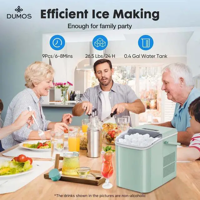 • FAST ICE MAKINGThe ice maker can make 9 bullet-shaped ice cubes in just 6 minutes. Fill 1.5L of water into the water tank, maximum ice capacity can reach 26.5 pounds in 24 hours. Say goodbye to long waiting times and enjoy a constant supply of ice whenever you need it. It has a transparent window, so you can watch the ice being made.