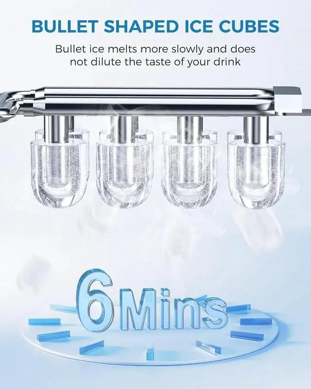Quick Ice Making: The COWSAR ice maker is equipped with a powerful compressor to bring you an efficient ice-making experience. It can make 8 bullet-shaped ice cubes in just 6 minutes, and the ice production capacity can reach 26.5 pounds in 24 hours.