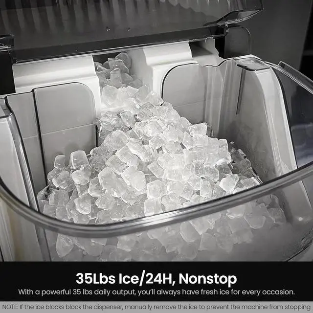 7 Mins Ice Makingnugget ice maker only take 7mins to enjoy the fist round of chewable ice. The new upgraded compressor products 35lbs/24Hrs, Continuous ice making, no longer need to store ice!